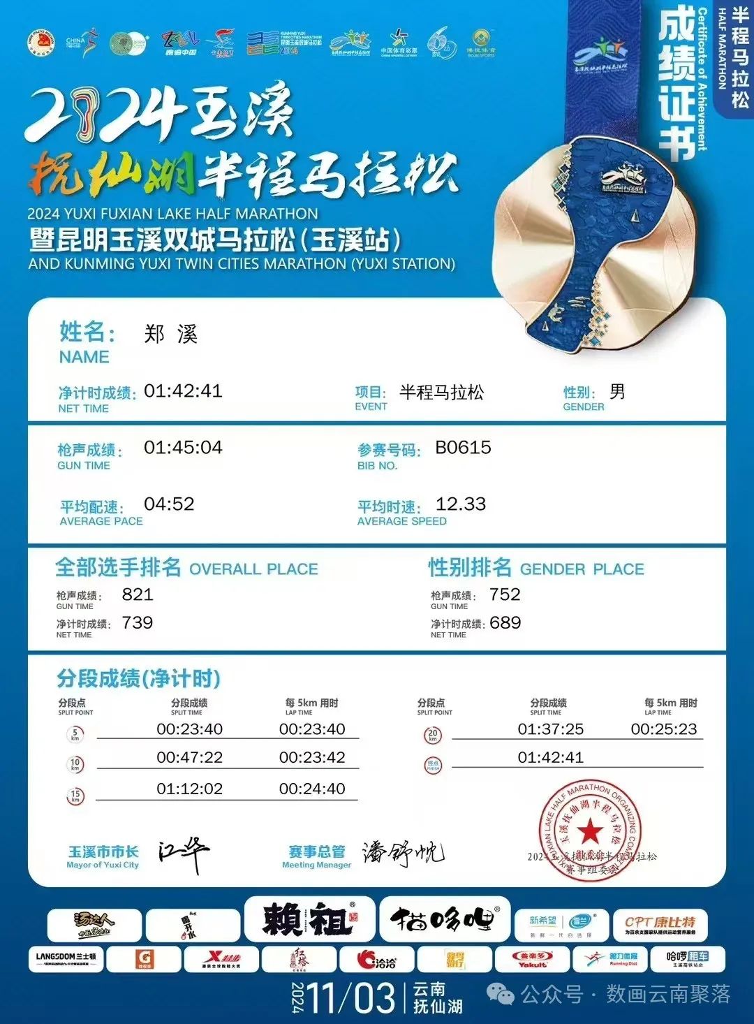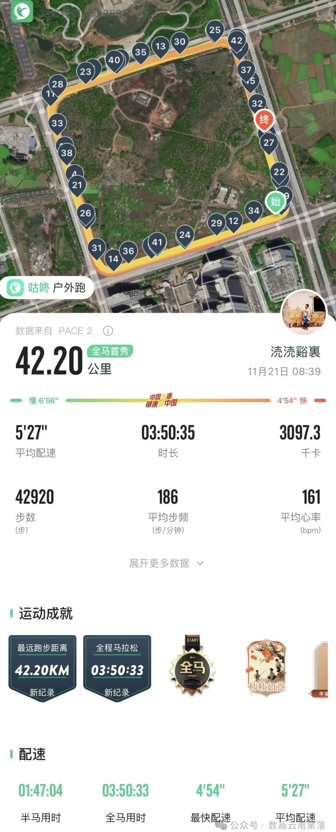 2024年11月21日早晨,從8:39開啟跑步手表記錄,到12:29按下停止鍵,我用3:50:30(3小時50分30秒)的時間,完成了人生第一個全程馬拉松——42.195公里。在海拔1950米的昆明,在終于達到這個距離的那一刻,我略顯平靜地仰望著湛藍的天空——42年的人生過往,塑造了更能平靜而欣然接納自己所有狀態(tài)的此刻心情。