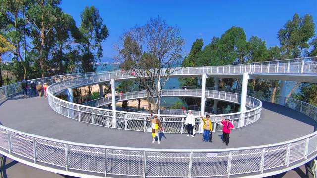 直接導航:南滇池沙灘。無需任何門票,從木棧道走到沙灘盡頭,就能到達湖之橋入口,沿途的海濱風景也是絕美風景。棧橋步道寬闊平坦,白色的橋身簡潔好看,是散步、溜娃、鍛煉的絕佳之地。漫步在橋上,特別舒服愜意,走到頂層就可以盡情感受藍天和微風了。走到橋頂,就可以拍到湛藍的滇池和獨特的環(huán)形步道。