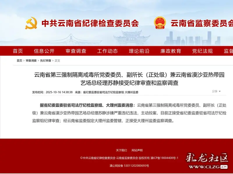 據(jù)省紀(jì)委監(jiān)委駐省司法廳紀(jì)檢監(jiān)察組、大理州監(jiān)委消息:云南省第三強(qiáng)制隔離戒毒所黨委委員、副所長(zhǎng)(正處級(jí))兼云南省漠沙亞熱帶園藝場(chǎng)總經(jīng)理蘇靜涉嫌嚴(yán)重違紀(jì)違法,主動(dòng)投案,目前正接受省紀(jì)委監(jiān)委駐省司法廳紀(jì)檢監(jiān)察組紀(jì)律審查;經(jīng)云南省監(jiān)委指定大理州監(jiān)委管轄,正接受大理州監(jiān)委監(jiān)察調(diào)查。(昆明信息港AI平臺(tái)生成)