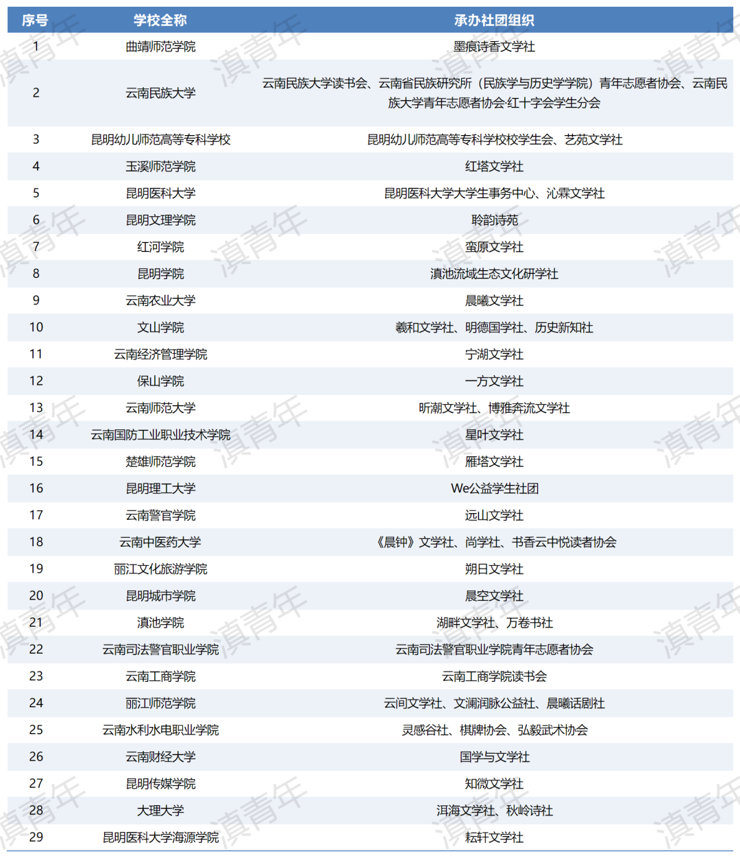 根據(jù)第五屆“滇青年”三行情書征文比賽籌備規(guī)劃,經(jīng)昆明網(wǎng)絡(luò)文學協(xié)會、昆明信息港彩龍社區(qū)、滇青年、滇池學院 湖畔文學社 定向邀請 和 公開報名,截至目前云南高校賽道共計確認 29 個賽區(qū),包括 44 個承辦社團、組織。