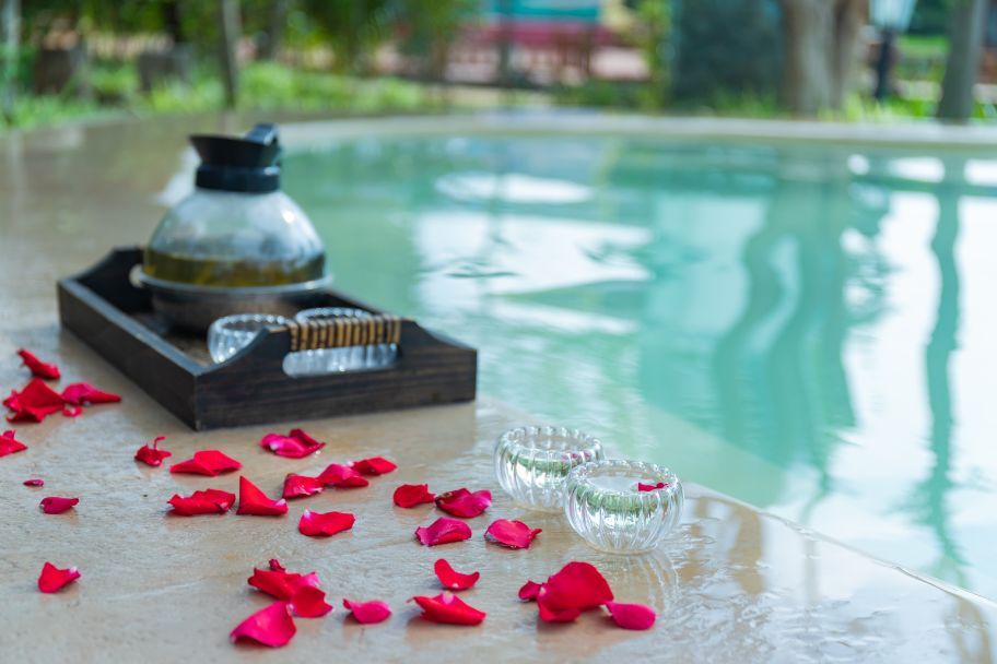 玫瑰泡池,含有純天然植物精油,空氣中除了硫磺的味道,還有淡淡的玫瑰芬芳,讓人神清氣爽。