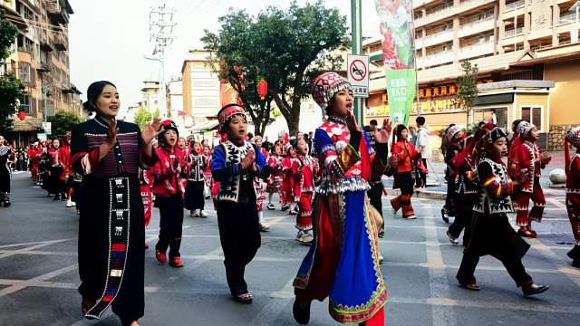 在铓鑼大鼓的雄渾節(jié)奏里,禮俗文化方陣率先邁步,“咪谷”引領(lǐng)著祭拜寨神的儀式,牛角高揚,香火氤氳,將哈尼族對天地的敬畏與祈福娓娓道來。緊隨其后的鄉(xiāng)鎮(zhèn)方陣身著斑斕盛裝,少數(shù)民族繡娘織就的服飾流光溢彩,“同尼尼”的粗獷舞姿隨鼓點搖擺,擰身擺臀間是農(nóng)耕文明的鮮活印記,棕扇舞的輕盈轉(zhuǎn)身里藏著民族的溫柔情愫。