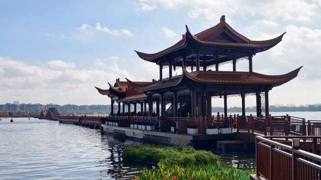 行至東風壩,視野驟然開闊。寬闊的堤壩沿著湖岸延伸,一側是波光粼粼的滇池,遠處的西山睡美人裹在淡淡的霧靄中,眉眼朦朧,更添幾分悠遠;另一側是成片的濕地,水草褪去了翠綠,化作深褐與淺黃,卻依舊豐茂,成了水鳥棲息的樂園,偶有白鷺展翅高飛,素白的身影掠過枯黃的草葉與湛藍的天空,定格成一幅詩意的剪影。壩上游人如織,有人舉著相機定格這冬日盛景,有人依偎在欄桿邊低聲交談,孩子們追著海鷗奔跑,笑聲清脆,驅散了寒日的清冷。風穿過堤壩,帶著湖水的涼意,卻吹不散游人的熱忱。