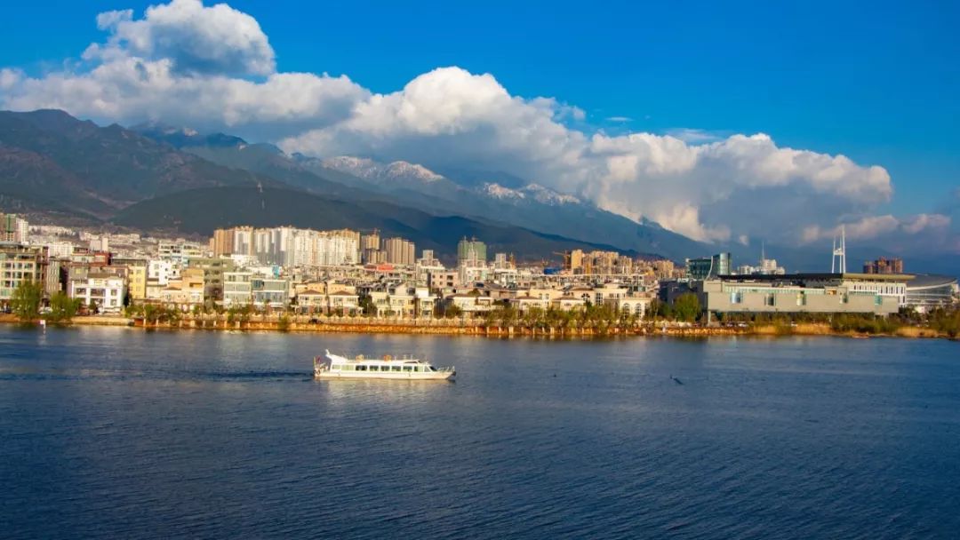 游船駛離岸邊碼頭,站在船上看城區(qū),看蒼山,只見(jiàn)城區(qū)高樓林立,蒼山延綿百里。