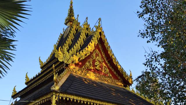 金碧輝煌的主寺,是傣家僧眾誦經(jīng)修行的清凈之地。陽光穿過雕花窗欞,在紅地毯上投下細碎的紋路,像撒了一地跳躍的金箔。殿內(nèi)素幡垂落,素雅的布條上印著經(jīng)文,在燭火的光暈里輕輕拂動,藏著歲月沉淀的安然。偶有梵音從殿中飄出,與風鳴蟬噪相融,更添幾分空靈。