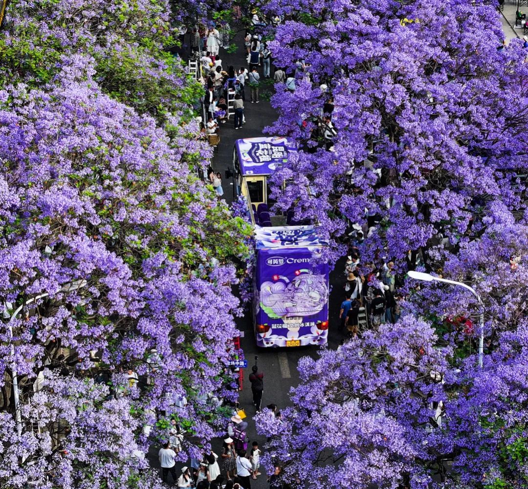 春日的花海與湖光山色交織、教場(chǎng)路上成片的藍(lán)花楹為昆明播撒春日浪漫;