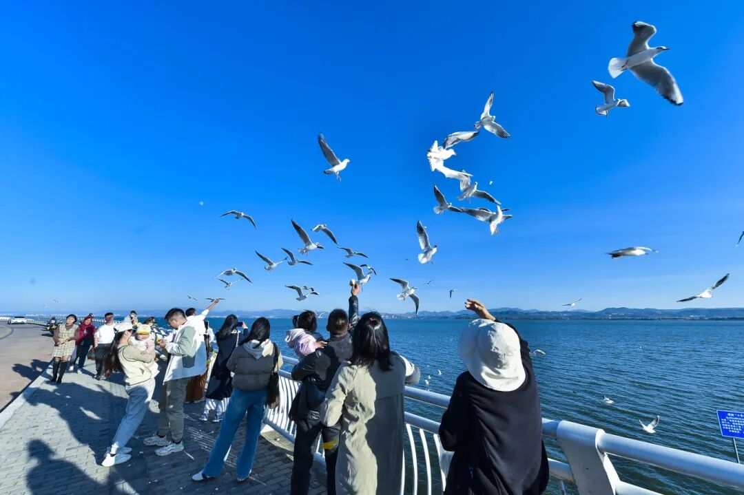 到了冬天,紅嘴鷗如約而至在滇池上空盤旋飛舞,構(gòu)成一幅人偶和諧的溫馨畫面。