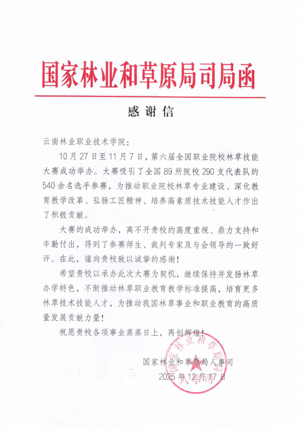 近日,云南林業(yè)職業(yè)技術學院收到國家林業(yè)和草原局人事司發(fā)來的感謝信,對我校在第六屆全國職業(yè)院校林草技能大賽中的出色承辦工作予以高度肯定和誠摯感謝。同期,學校還榮獲大賽組委會頒發(fā)的“突出貢獻獎”,彰顯了我校在職業(yè)教育領域的擔當與實力。