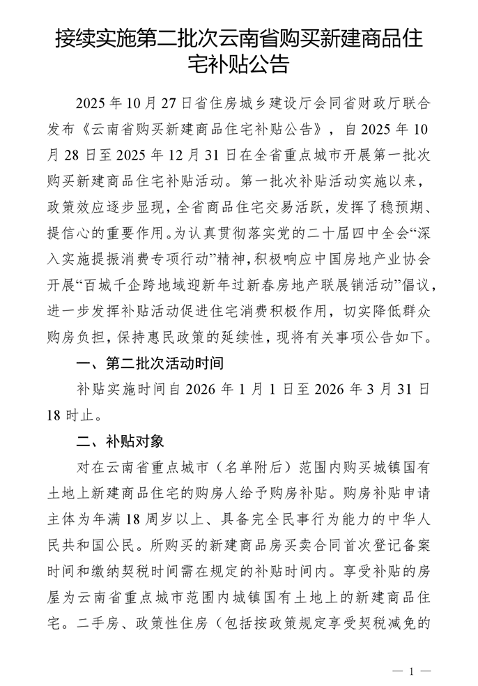 12月30日,云南省住房和城鄉(xiāng)建設(shè)廳發(fā)布《接續(xù)實(shí)施第二批次云南省購買新建商品住宅補(bǔ)貼公告》,將啟動(dòng)第二批次購房補(bǔ)貼活動(dòng),補(bǔ)貼實(shí)施時(shí)間自2026年1月1日至3月31日18時(shí)。本次彩云住房消費(fèi)券活動(dòng)先到先得。