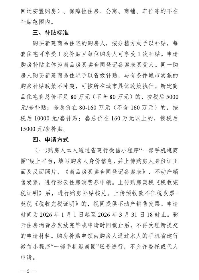 申請(qǐng)時(shí)間為2026年1月1日至3月31日18時(shí)。彩云住房消費(fèi)券發(fā)放完畢或申請(qǐng)時(shí)間截止后,不再受理新提交的申請(qǐng)材料。購房補(bǔ)貼申領(lǐng)由購房人通過本人的手機(jī)省建行微信小程序“一部手機(jī)逛商圈”賬號(hào)進(jìn)行,不允許委托或代人申請(qǐng)。