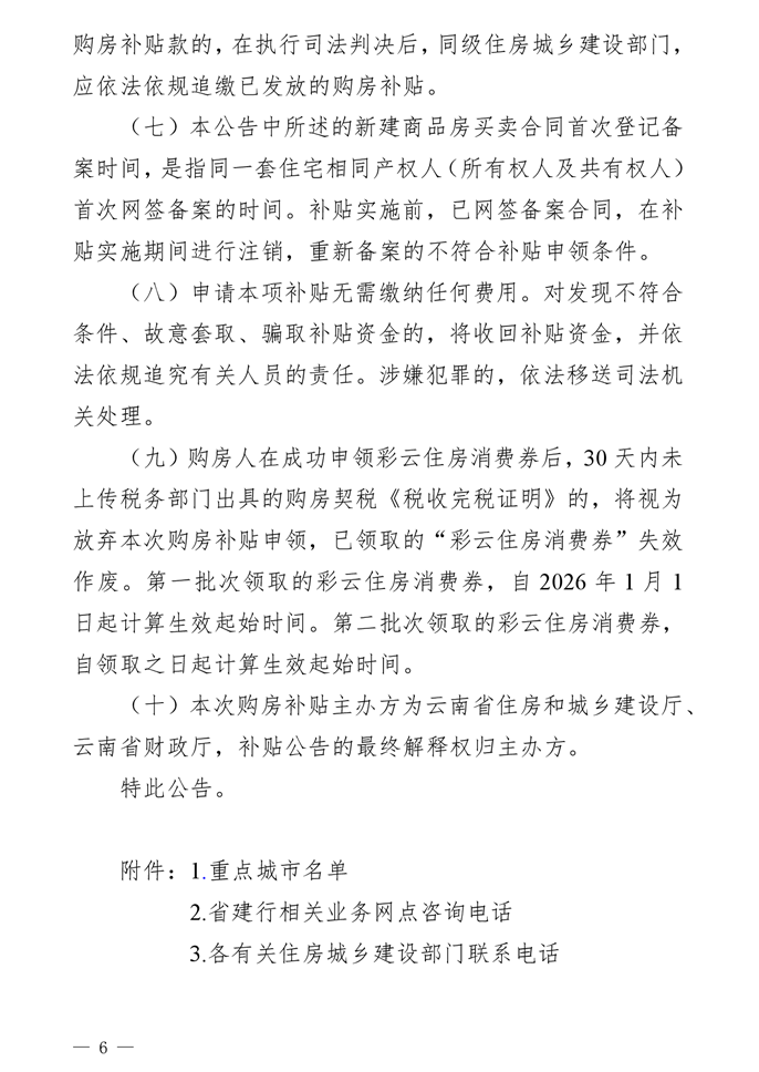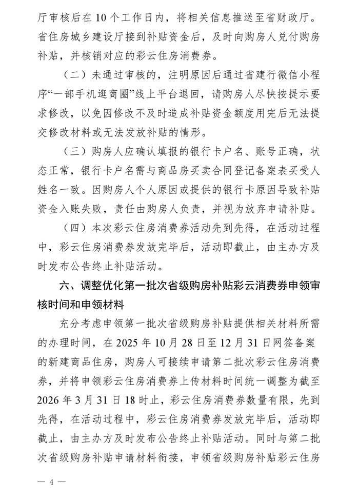 本次住房補(bǔ)貼發(fā)放,調(diào)整優(yōu)化了第一批次省級(jí)購房補(bǔ)貼彩云消費(fèi)券申領(lǐng)審核時(shí)間和申領(lǐng)材料要求。充分考慮申領(lǐng)第一批次所需的辦理時(shí)間,在2025年10月28日至12月31日網(wǎng)簽備案的新建商品住房,購房人可接續(xù)申請(qǐng)第二批次彩云住房消費(fèi)券,并將申領(lǐng)彩云住房消費(fèi)券上傳材料時(shí)間統(tǒng)一調(diào)整為截至2026年3月31日18時(shí),彩云住房消費(fèi)券數(shù)量有限,先到先得,在活動(dòng)過程中,彩云住房消費(fèi)券發(fā)放完畢后,活動(dòng)即截止,由主辦方及時(shí)發(fā)布公告終止補(bǔ)貼活動(dòng)。