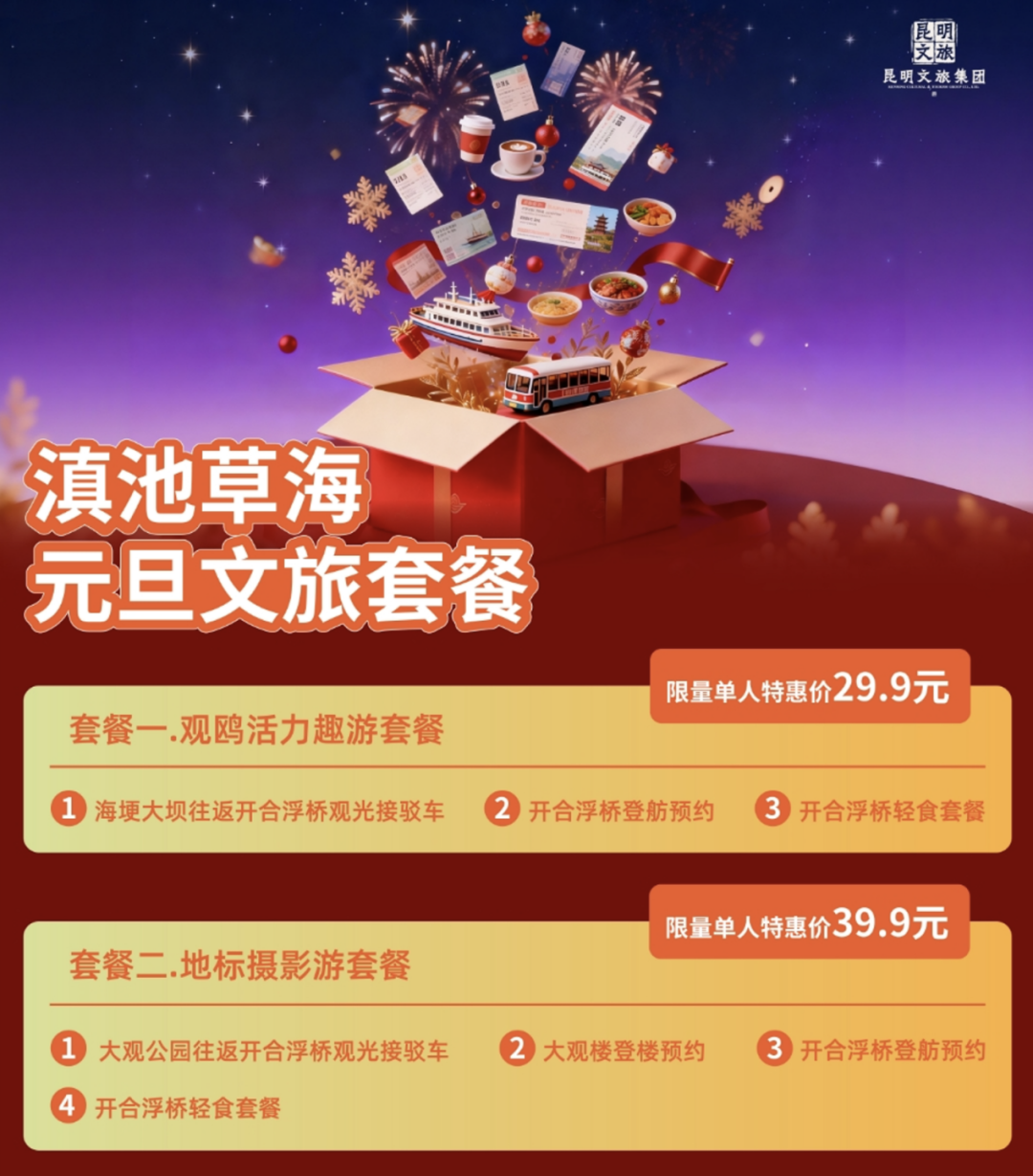 元旦假期,昆明文旅集團推出驚喜滿滿的新年文旅“套餐”,為您開啟暢游滇池草海的全新體驗!本次文旅套餐產(chǎn)品在“智游春城”微信小程序限時限量發(fā)售,品質(zhì)UP!
