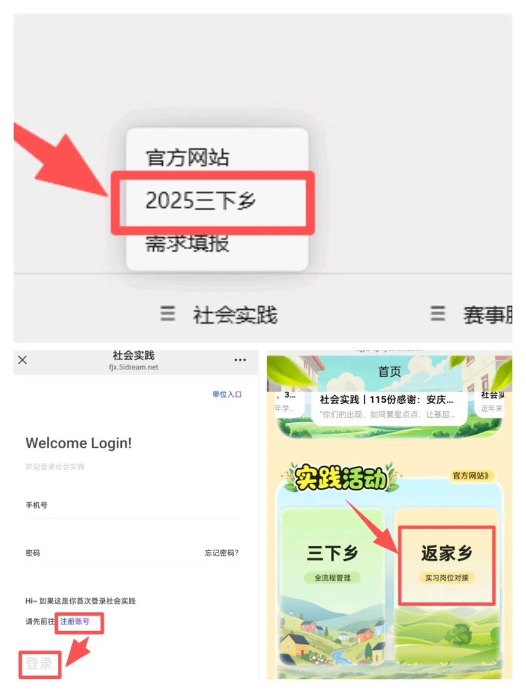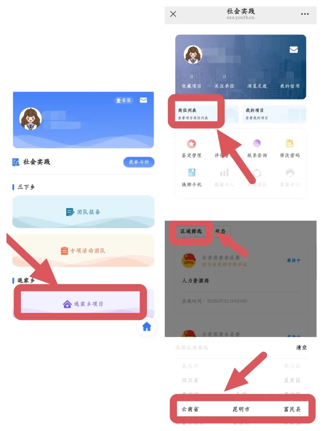 關(guān)注“創(chuàng)青春”公眾號,選擇“社會實踐”—“2025三下鄉(xiāng)”欄目。首次登錄用戶需按提示注冊賬號,已注冊的學(xué)生或有高校第二課堂成績單系統(tǒng)賬號的學(xué)生可直接登錄。登錄后選擇返家鄉(xiāng)項目進入可查看崗位列表,通過區(qū)域篩選,選擇共青團富民縣委發(fā)布的崗位信息,進行選擇報名。