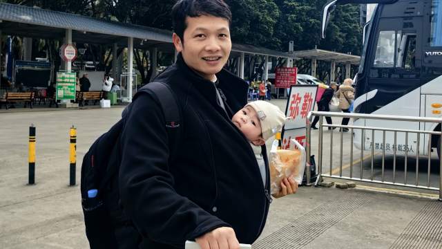 年輕的父親背負(fù)行囊,懷擁幼子,右手拖著行李箱,左手還攥著孩子的牛奶與自己的早餐。步履匆匆間,沉默的負(fù)荷勾勒出愛的形狀。就在那一刻,他忽然側(cè)首,與胸前的孩子一同望向我的鏡頭——兩雙清澈的眼睛在疲憊中綻開微笑。我按下快門,心被無聲擊中。原來最深的感動(dòng),常來自陌生人身上那份舉重若輕的溫柔。