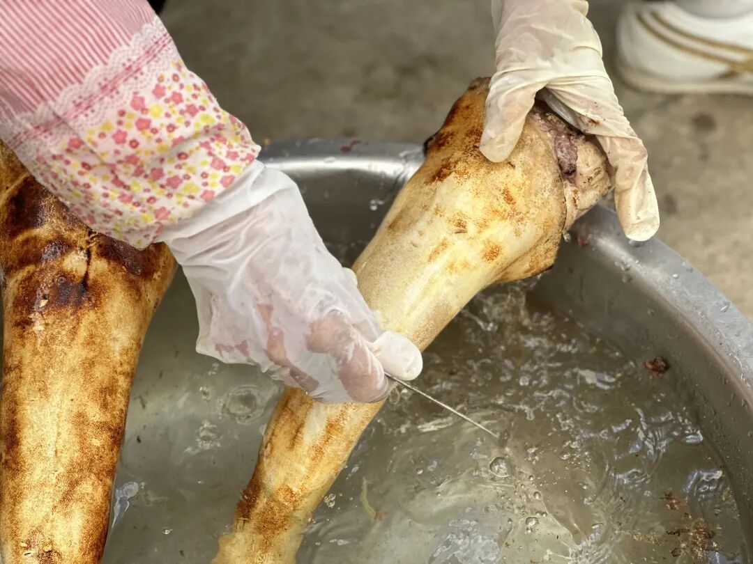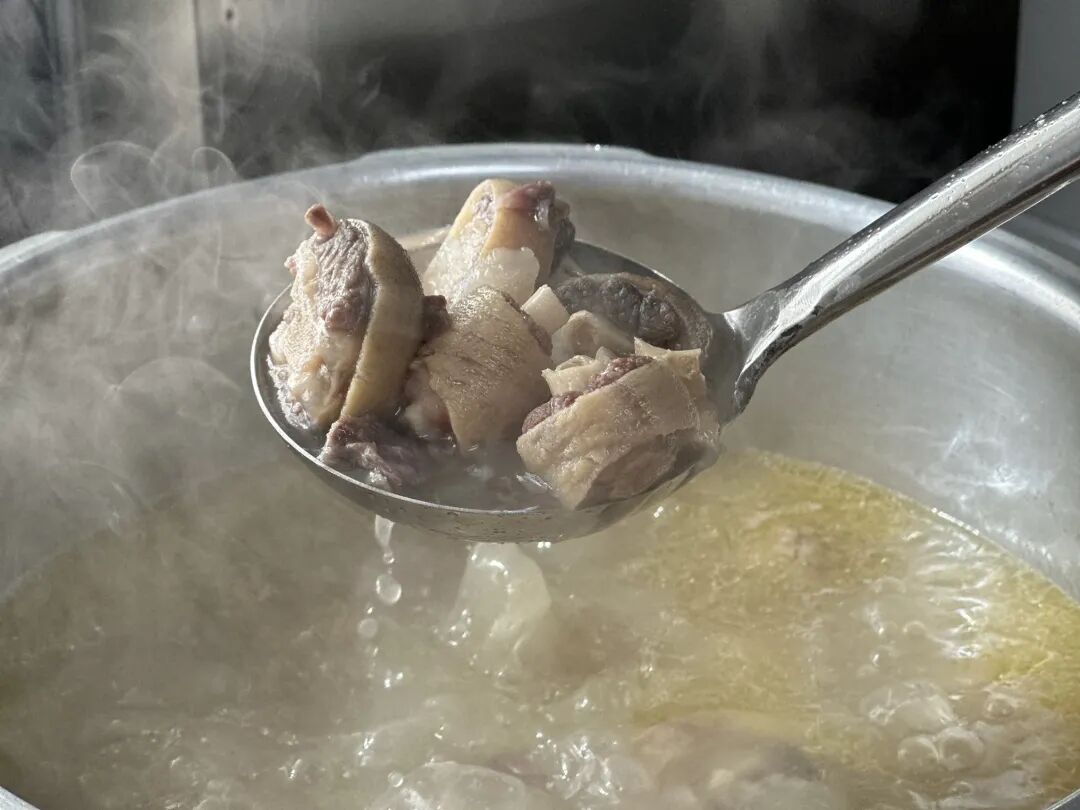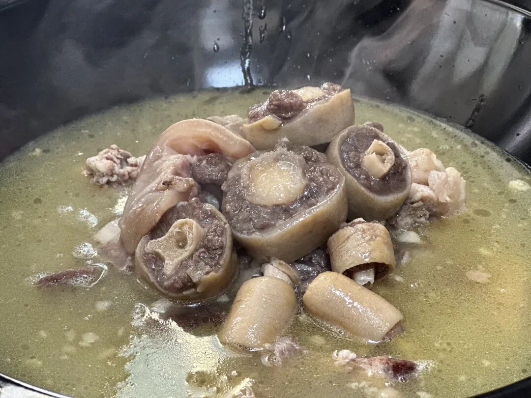 在蕓肴閣,每根牛尾都有嚴(yán)格的“出道標(biāo)準(zhǔn)”——每天清晨采購(gòu)來(lái)最新鮮的牛尾巴,洗刷干凈后,拿火細(xì)細(xì)燒皮去毛,再將燒好的牛尾刮洗干凈。處理好的牛尾扔進(jìn)牛骨熬制的醇厚高湯里,燉煮四五個(gè)小時(shí),直到肉質(zhì)耙糯、膠質(zhì)滿(mǎn)滿(mǎn)。