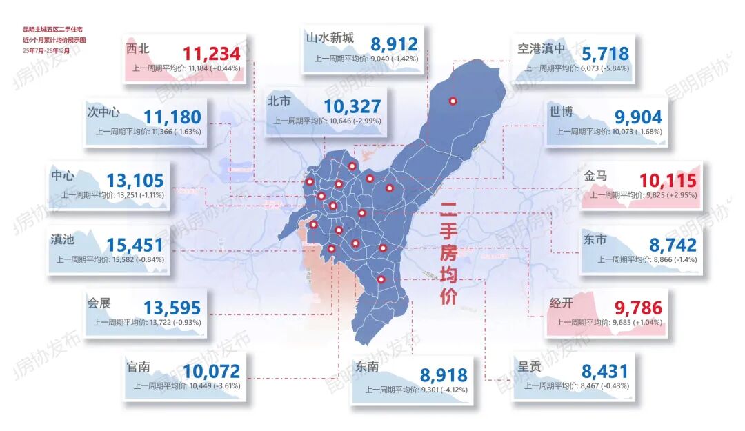 1月15日,昆明市房地產(chǎn)開(kāi)發(fā)與經(jīng)紀(jì)協(xié)會(huì)發(fā)布主城五區(qū)近六個(gè)月(2025年7月—12月)新房、二手房住宅均價(jià)可視化地圖,公布了覆蓋15個(gè)核心板塊的價(jià)格數(shù)據(jù)與漲跌走勢(shì)。