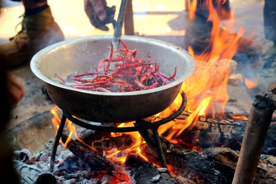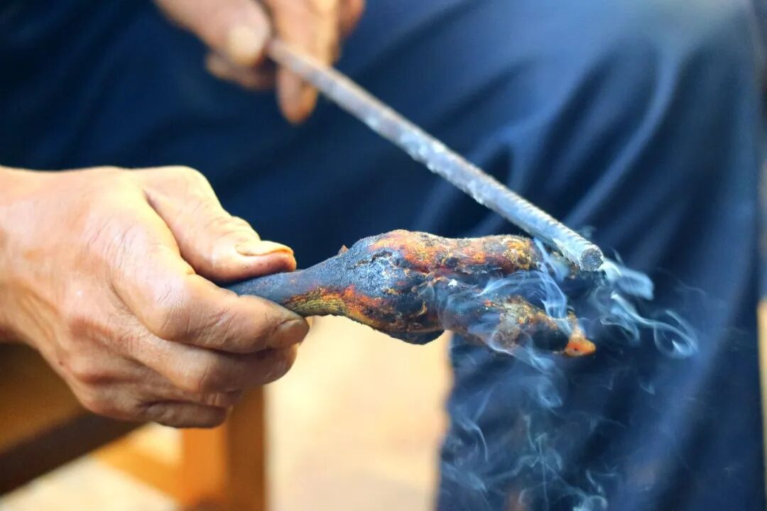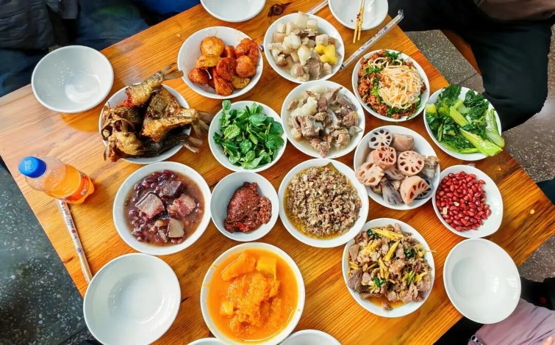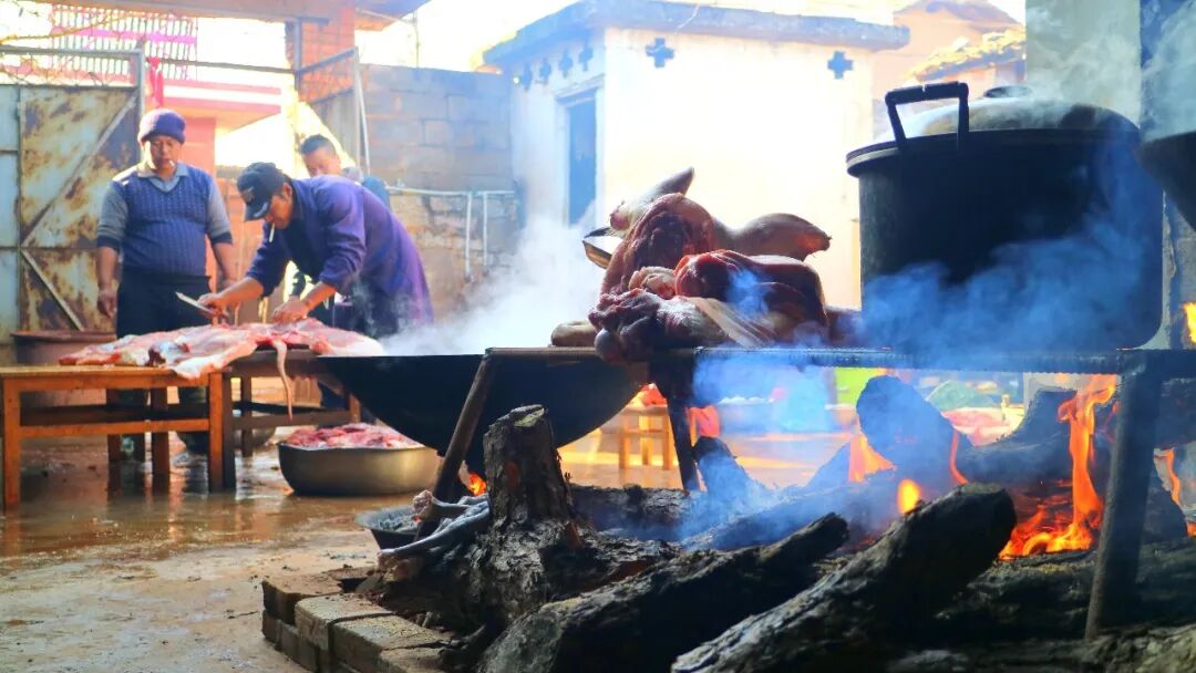 晴朗吉日里,壯實的漢子們吆喝著抬上年豬,滾燙熱水蒸騰起白霧,阿婆在盆中撒好香料,接住溫?zé)嶝i血,靜待這份最鮮嫩的珍饈凝結(jié)。豬處理分割好后,哥弟兄們翻腸、腌肉、剁排骨、燒豬頭;妯娌們圍坐案板,洗菜切菜,切菜聲與笑語交織,柴火煙氣裹著豬皮焦香氣息漫遍庭院,火塘邊的豬頭豬腳燒得滋滋冒油。