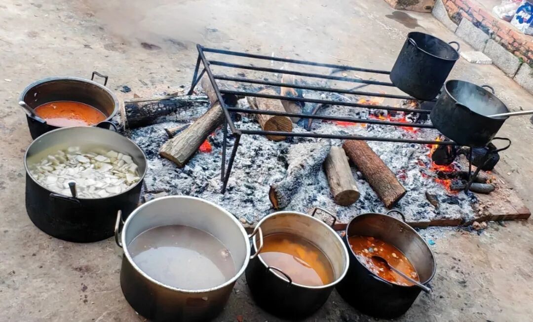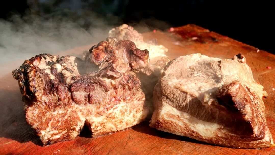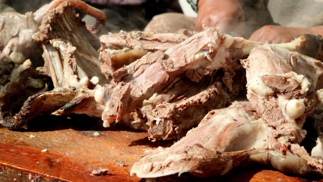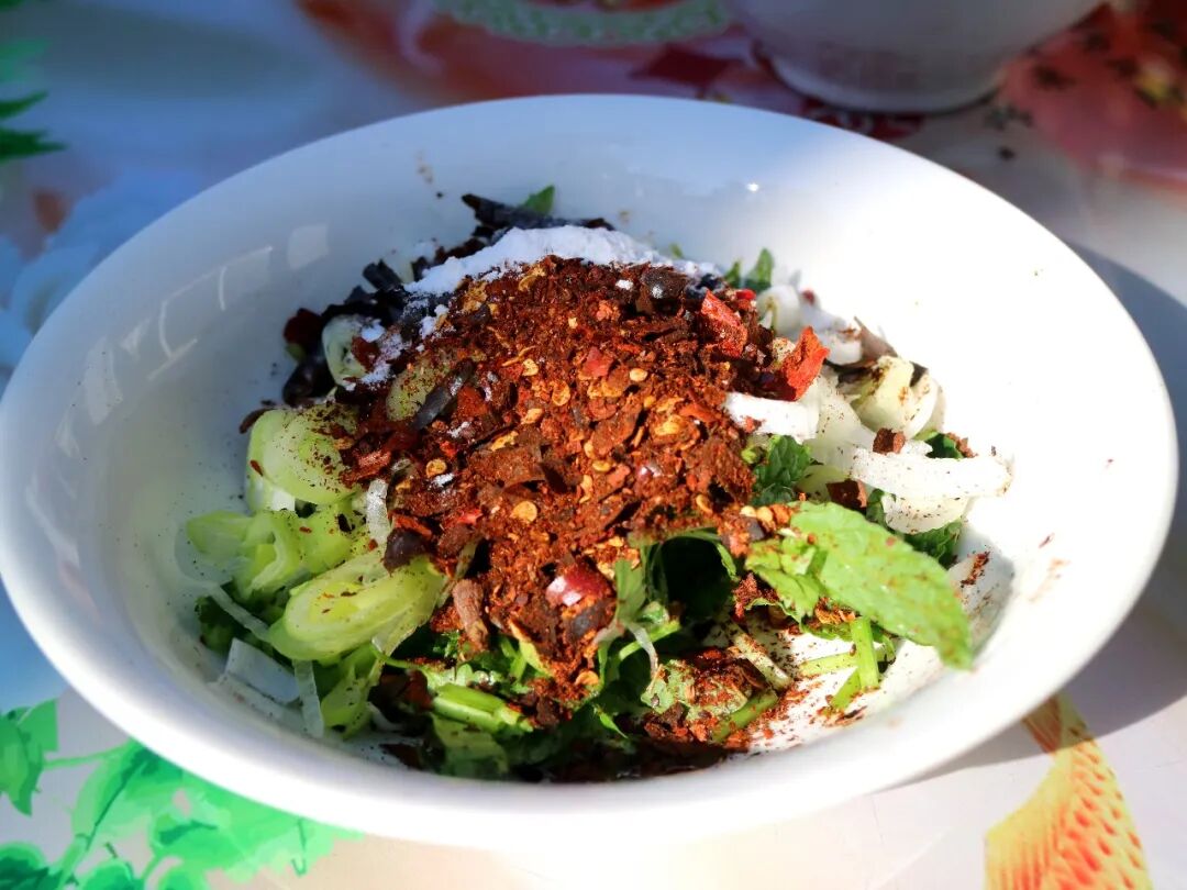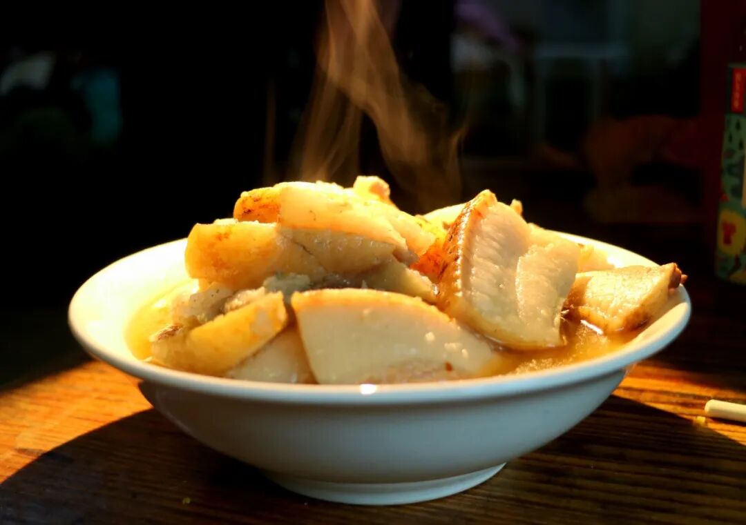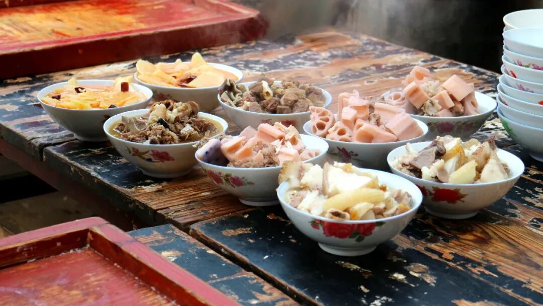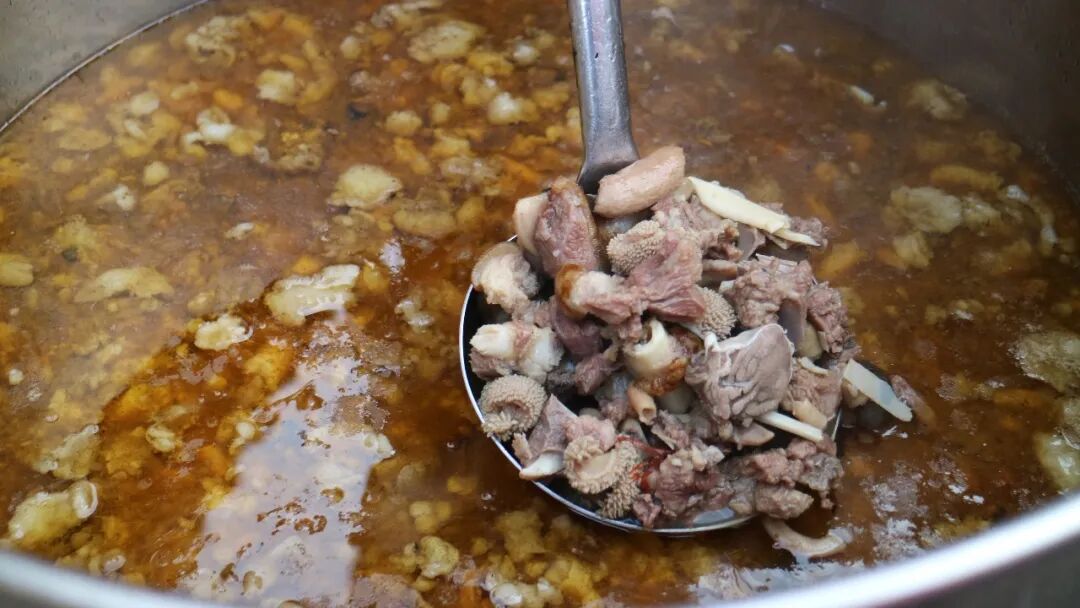 簡易的柴火灶上,一排燉鍋煮著新鮮的豬肉、羊肉等食材,生澀的肉塊在柴火的加持下,肉皮慢慢收緊,滲出的油脂浮在湯面,泛起一層薄薄的油光。這樣燉煮一直持續(xù)到下午,鍋中的湯肉漸漸顯露出燉煮的精髓,瘦肉泛著溫潤的淺褐色,肥肉則晶瑩剔透,輕輕一碰便在湯里晃動,入口即化的前奏在鍋中已然醞釀成熟。