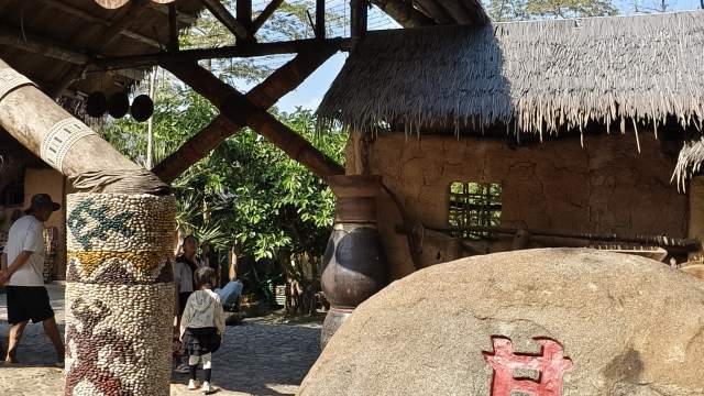 檳榔谷無愧“5A”級景區(qū)之名,民族風(fēng)情濃郁如美酒,令人沉醉其中而不愿歸。甫一踏入景區(qū)大門,五位黎家小伙子立于巍峨門樓之上,擂響震天迎賓鼓,鼓聲如雷貫耳,激蕩心魄;數(shù)名黎族少女身著彩裙,輕盈起舞,笑靨如花,將熱情灑滿迎接遠(yuǎn)方來賓。一位清秀可人的黎族導(dǎo)游款款而來,教我們輕聲念出黎語“布隆”(你好)——那一聲問候,仿佛穿越山林古寨,喚醒了沉睡的民族文化記憶。一場關(guān)于黎族歷史與生活的詩意旅程,就此在鼓點(diǎn)與笑聲中悄然啟程。