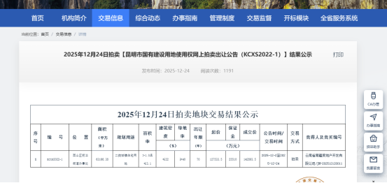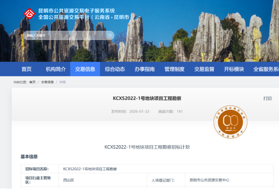1月22日,昆明市公共資源交易平臺發(fā)布KCXS2022-1號地塊三項招標公告,涵蓋工程勘察、工程監(jiān)理及設(shè)計施工總承包,招標金額分別為140萬元、290萬元、103008.95萬元,為地塊開發(fā)搭建起核心建設(shè)框架。