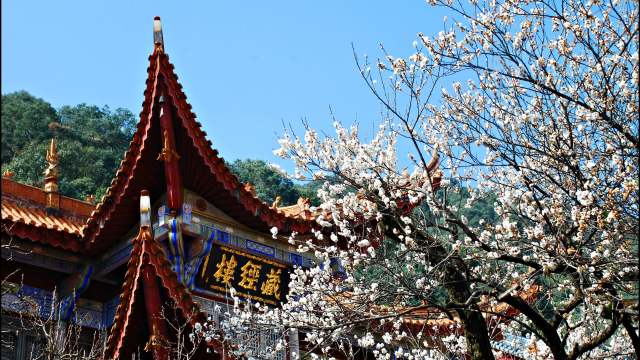 金燦燦的藏經(jīng)樓三個字可在多個角度嵌入梅花圖中。藏經(jīng)樓左邊也是飛檐翹角的古寺建筑,圍繞這一樹梅花,足夠拍出一組禪意深深的古風美景。