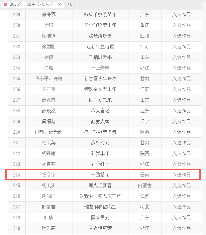 近日,備受矚目的2026年“新生活·新風(fēng)尚·新年畫”美術(shù)作品展評(píng)選結(jié)果正式公布。呈貢的民間繪畫骨干楊彥宇,憑借其作品《一路繁花》的獨(dú)特藝術(shù)魅力與深刻時(shí)代內(nèi)涵,成功從全國(guó)眾多優(yōu)秀參選作品中脫穎而出,榮耀入選本次展覽!
