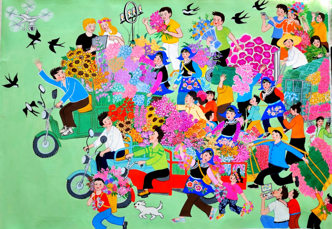 楊彥宇的《一路繁花》便是其中的亮眼之作。該作品聚焦云南省昆明市斗南花農(nóng)賣鮮花致富的生活形態(tài),主題鮮明地展現(xiàn)花卉市場(chǎng)的蓬勃活力與花農(nóng)辛勤致富的場(chǎng)景。在呈貢斗南,每天花卉市場(chǎng)都是人頭攢動(dòng),花農(nóng)們將精心培育的各類鮮切花卉整齊碼放,從花田運(yùn)往市場(chǎng),等待來自全國(guó)各地的客商。花農(nóng)通過現(xiàn)代化種植技術(shù)與電商銷售渠道,打破地域限制,讓斗南鮮花走向世界。同時(shí)也隱喻著新時(shí)代背景下人民對(duì)美好生活的向往與追求。作品不僅在色彩運(yùn)用上大膽明快,更在構(gòu)圖與意境營(yíng)造中傳遞出“新風(fēng)尚”的積極內(nèi)涵,成為連接傳統(tǒng)與現(xiàn)代、個(gè)體與時(shí)代的藝術(shù)紐帶。