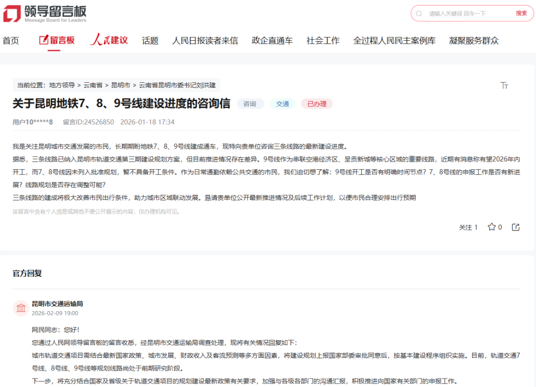 近日,針對網(wǎng)友在人民網(wǎng)領(lǐng)導(dǎo)留言板上關(guān)于“昆明地鐵7、8、9號線建設(shè)進(jìn)度”及“建議優(yōu)化調(diào)整市體育館站出入口”的留言,昆明市交通運(yùn)輸局分別進(jìn)行了回復(fù)。