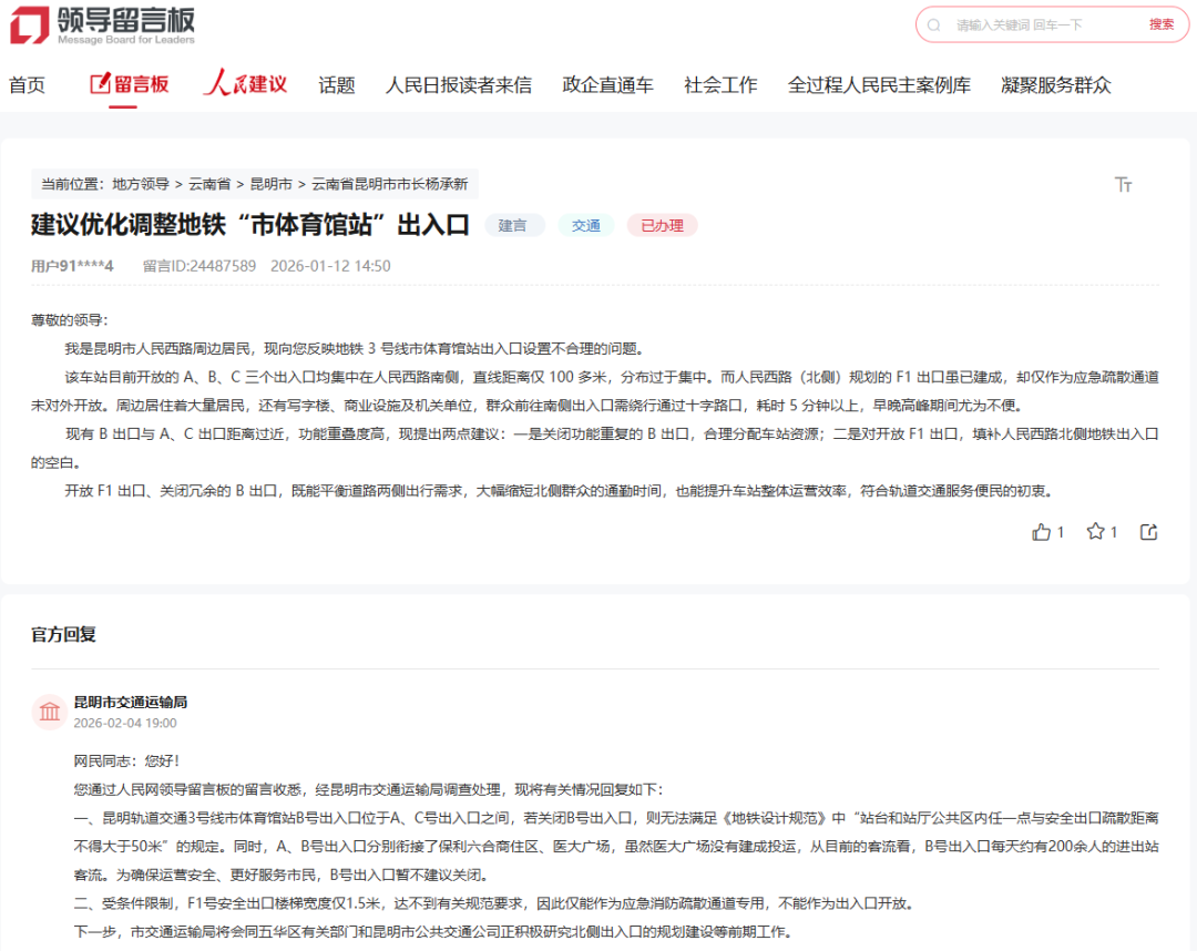 昆明地鐵市體育館站現(xiàn)有A、B、C口均集中在人民西路南側(cè),距離過近。北側(cè)F1口已建成卻未開放,周邊居民、上班族等前往地鐵需繞行路口。建議關(guān)閉B口,同時開放F1口,以平衡道路兩側(cè)出行需求,縮短通勤時間。