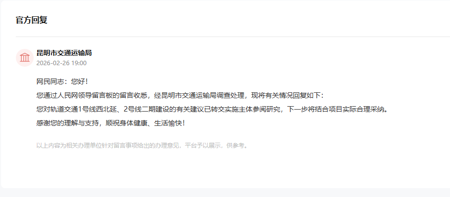 針對網(wǎng)友建言,昆明市交通運(yùn)輸局在回復(fù)中表示,已經(jīng)將網(wǎng)友的建議轉(zhuǎn)交給實(shí)施主體參閱研究,下一步將結(jié)合項目實(shí)際合理采納。